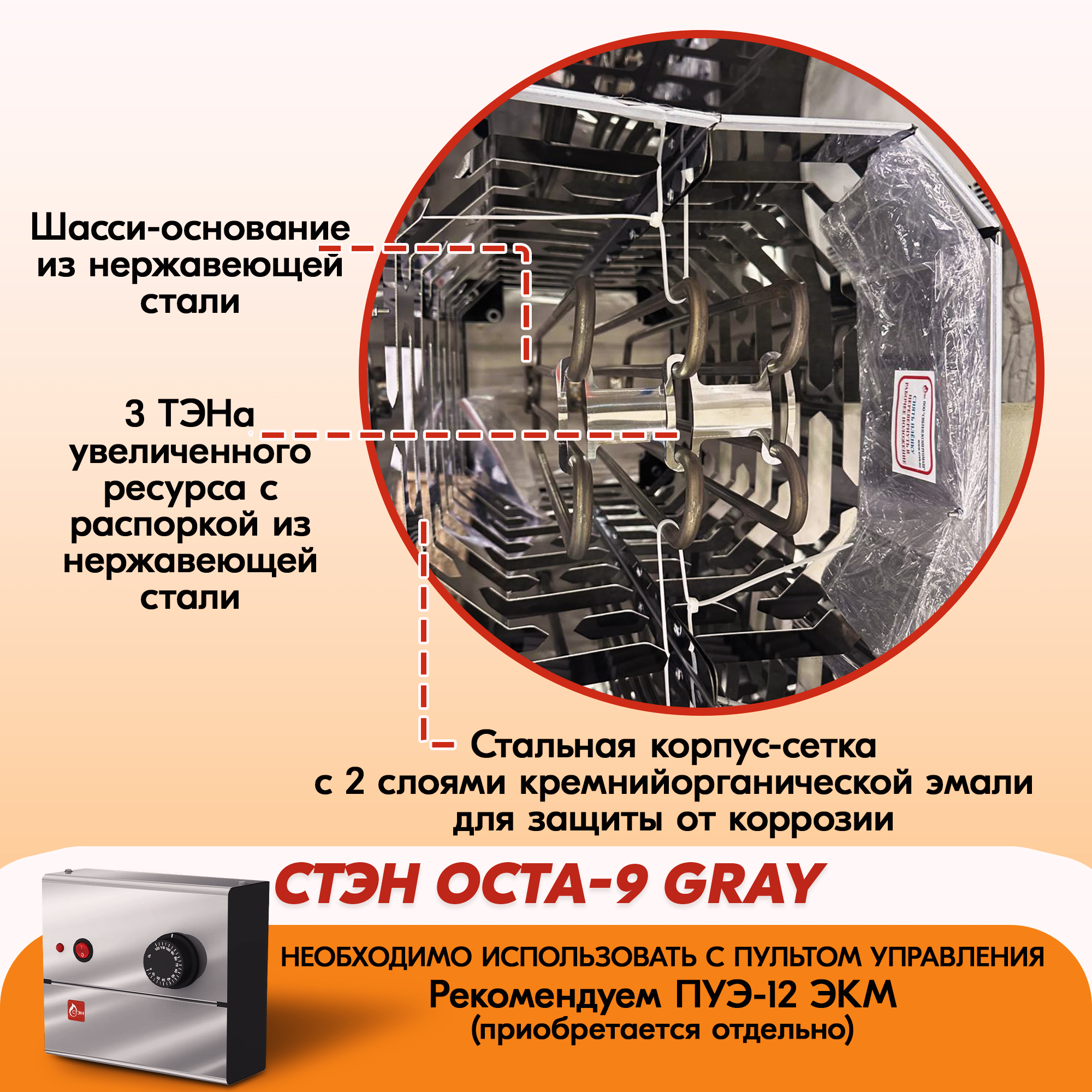 Электрическая каменка СТЭН ЭКМ 9 Octa gray в Пскове | Доставка по России