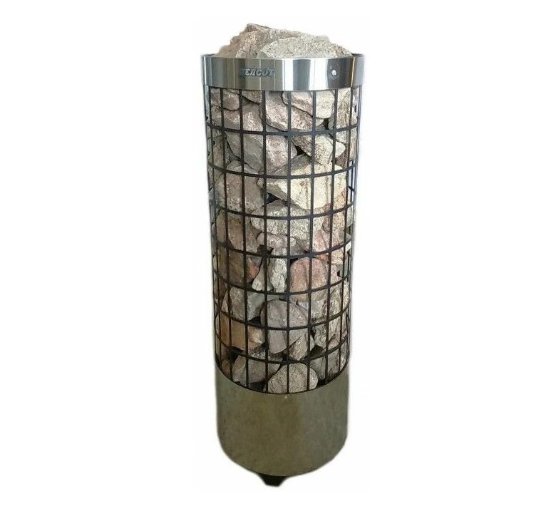 Особенности: цилиндрическая форма с прямоугольными вырезами на всей поверхности (конструкция в виде сетки), что обеспечивает комфортные условия нагрева помещения. Можно регулировать характер тепла от мягкого до сильного: достаточно плеснуть воды на боковую часть каменки или прямо сверху на камни.