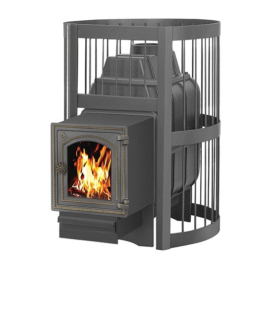 Банная чугунная печь Легенда Стандарт 28 (ДТ-4С) укомплектована чугунной не герметичной дверцей Везувий ДТ-4С с жаропрочным стеклом «SCHOTT ROBAX».  Конвекционно-вентилируемый кожух "Стандарт" изготовлен из металлического прутка диаметром 6мм покрашенной черной термостойкой краской.