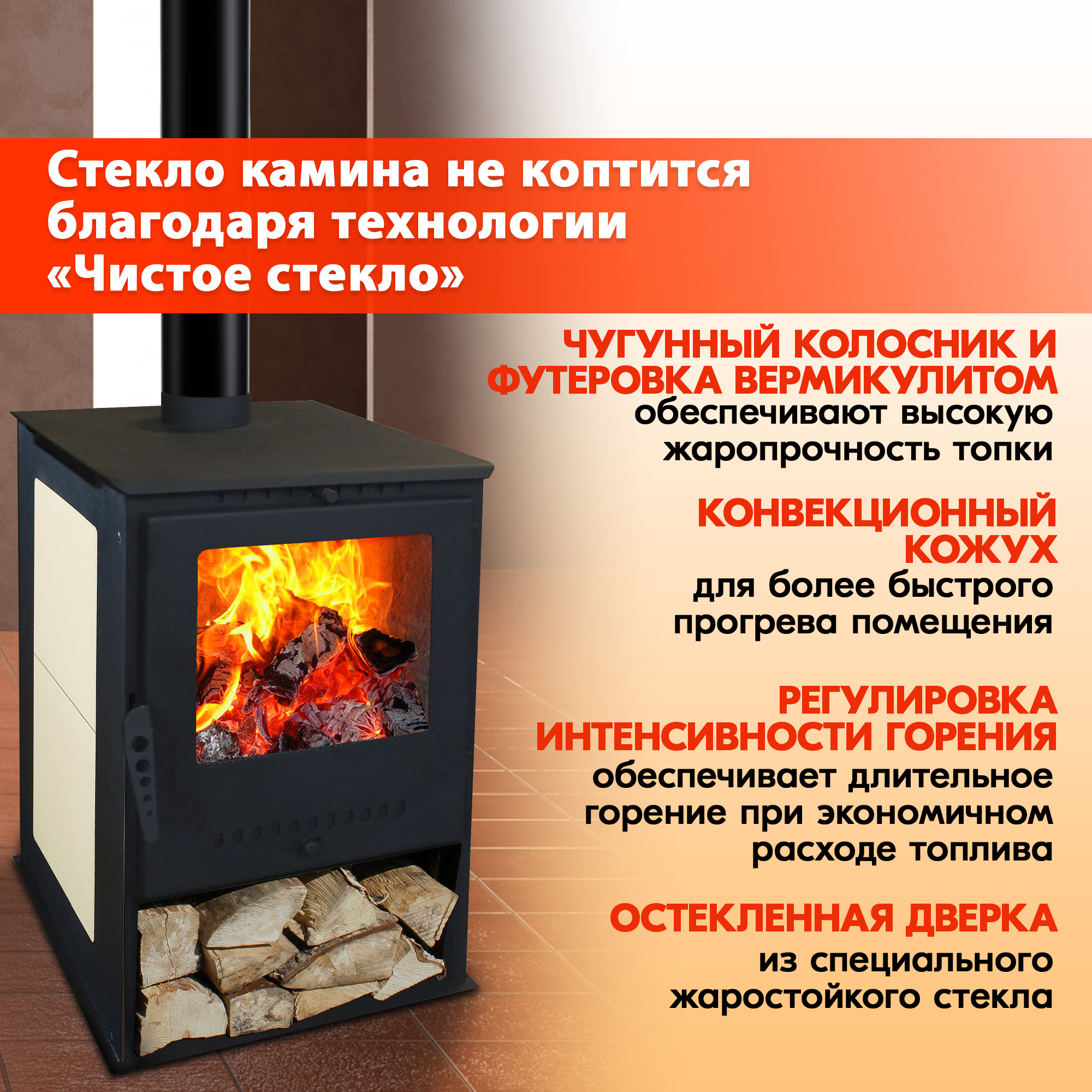 Конструкция печи-камина оснащена дверцей со вставкой из специального жаростойкого стекла, большое стекло позволяет наблюдать за янтарными переливами пламени.