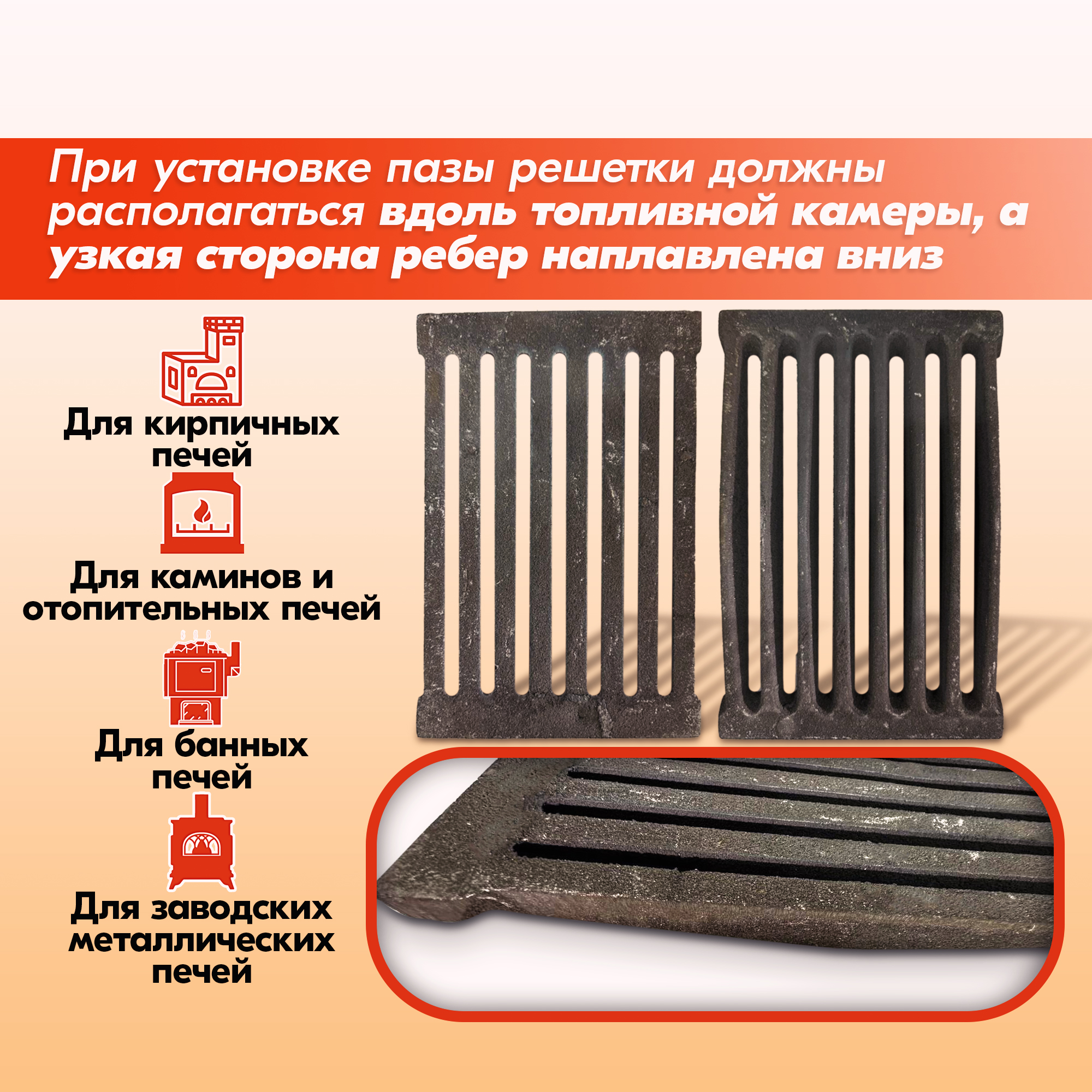 Колосник нужно устанавливать узкой стороной рёбер вниз, в противном случае срок его службы значительно снижается.